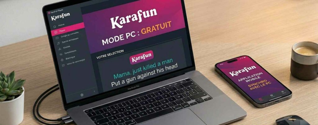 Moins connu que l’app mobile, KaraFun Player est un logiciel PC/Mac gratuit qui se connecte au catalogue KaraFun. Son atout majeur : la double fenêtre — une fenêtre de contrôle sur votre ordinateur, une fenêtre paroles en plein écran sur votre télévision via HDMI. Résultat : une vraie ambiance de karaoké professionnel chez vous.