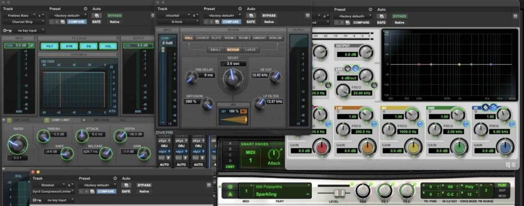 LMMSWindows / Mac / LinuxDébutant / beatmakersGratuit, léger, idéal MAO / EDMDesign daté, pas d’enregistrement audio classique